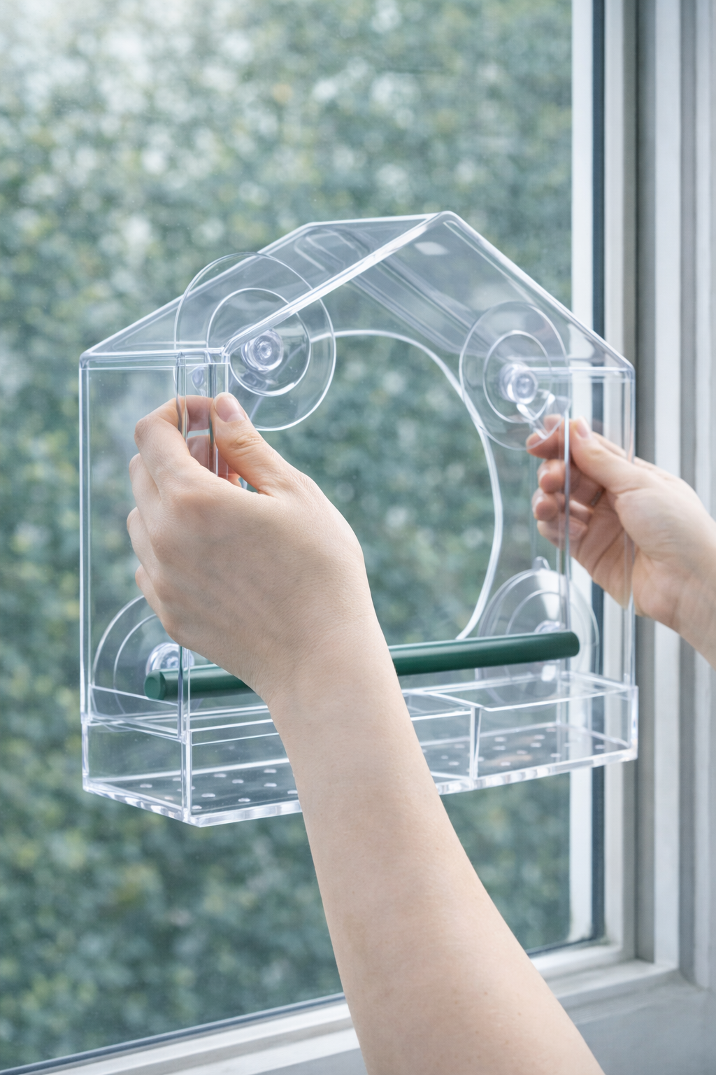 Comedero para aves con diseño de ventosas de gran sujeción, fabricado en acrílico transparente y resistente. Ideal para colocar en ventanas y disfrutar de la observación de aves desde casa.